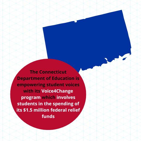 The Connecticut Department of Education created its Voice4Change program to empower high school students across the state to propose and vote on how more than $1.5 million in federal relief funds will be invested to reimagine Connecticut’s schools. Students in participating districts could submit proposals outlining how they would spend $20,000 in their school. Proposals deemed eligible to receive funds were ultimately voted on by their high school peers. Voice4Change represented 45 districts, 80 schools, and over 60,000 students.