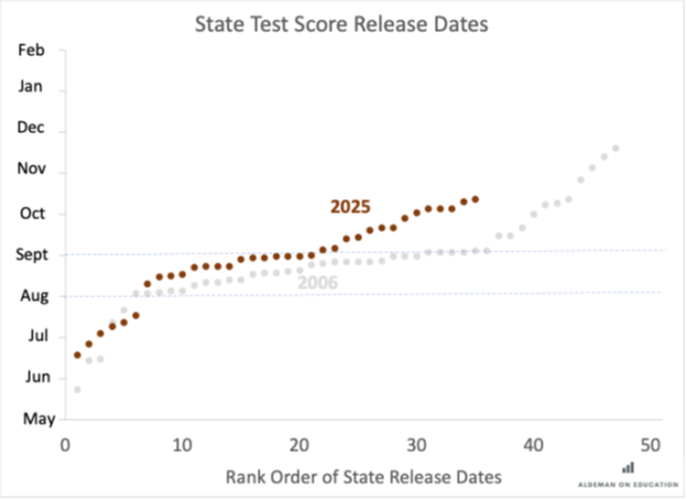 How long? In 2025, six states released their results by the end of July. That is, the fastest states today are on par with the fastest states from 2006. But the rest are worse. This year, only 20 states and the District of Columbia released their results before September 1st. Worse, 16 states had still not released their results when I looked in mid-October.